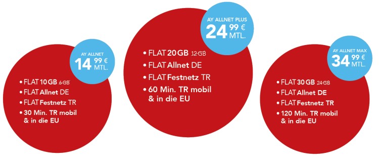 Neben dem Datenvolumen beinhalten die drei Vertragstarife auch Flatrates für Telefonie in alle deutschen Netze, eine Flatrate zum Telefonieren in das türkische Festnetz sowie Freiminuten für Anrufe in die Mobilfunknetze in der Türkei und in die EU.